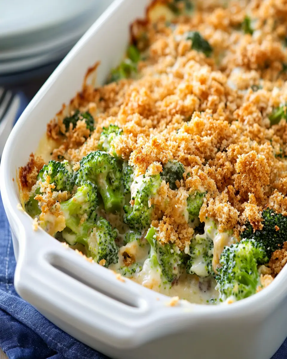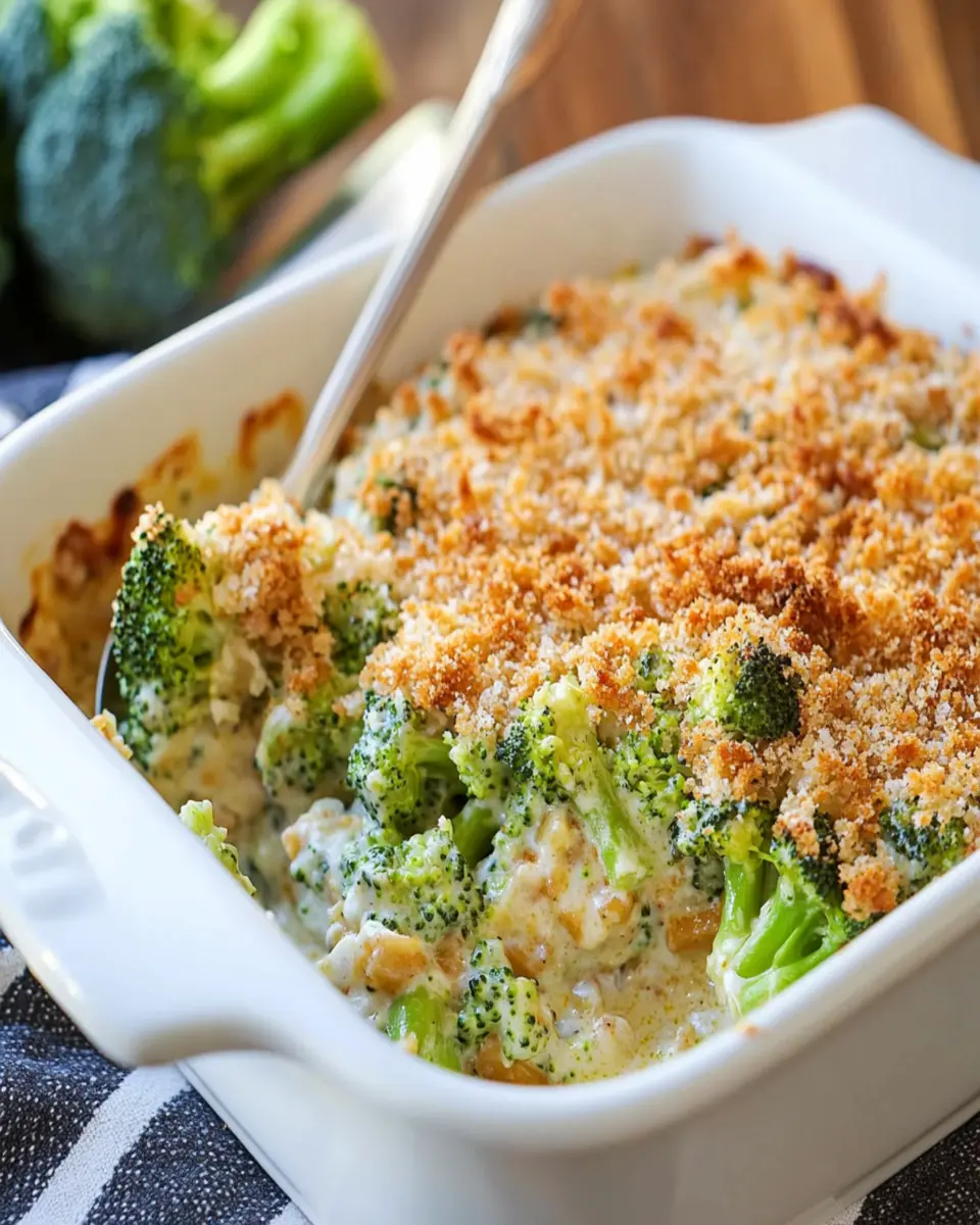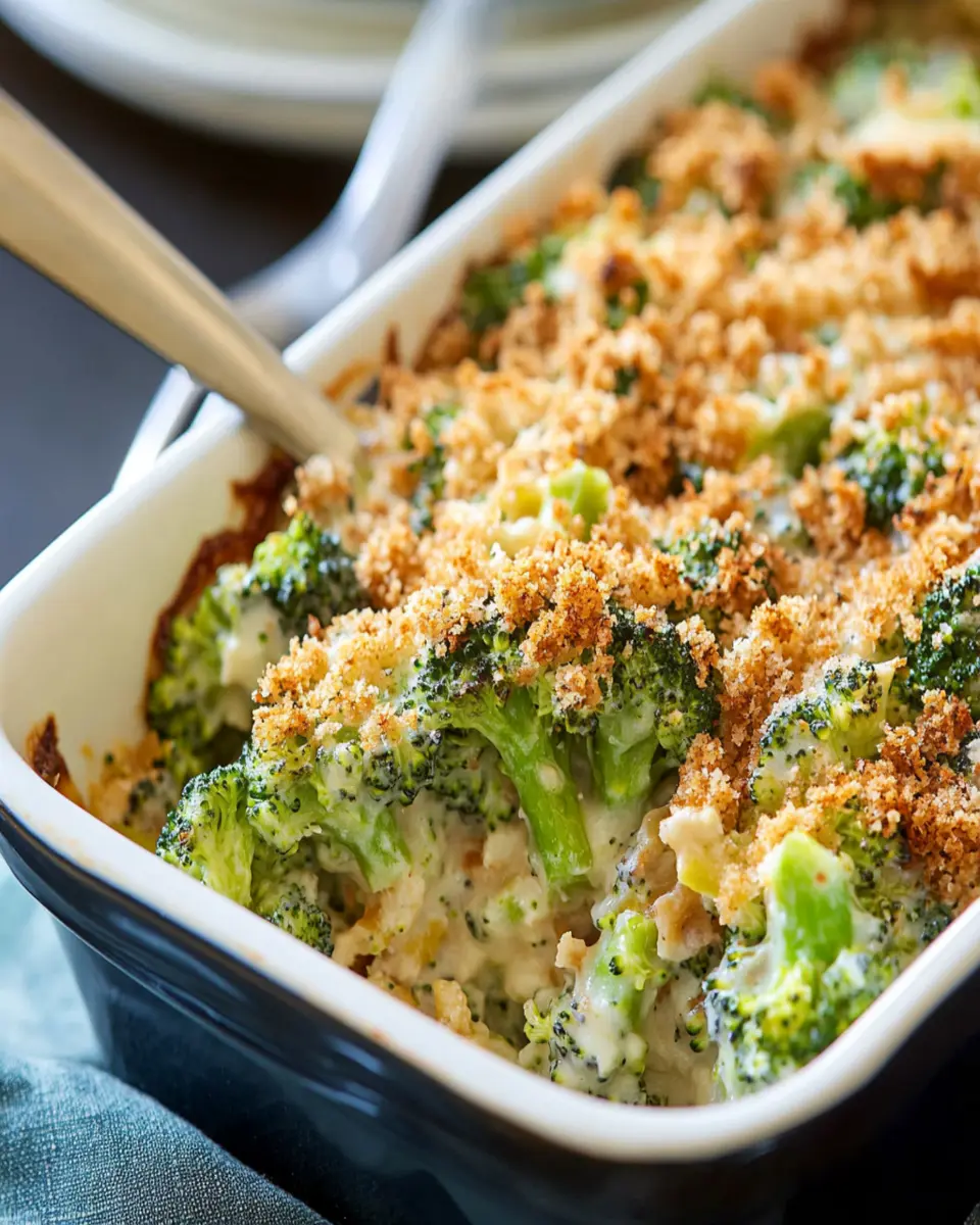 Imagine the aroma of fresh broccoli melding with rich cheddar cheese and savory cream of mushroom soup, creating a warm embrace of flavors that beckons you to the table. This dish is not only easy to prepare but also incredibly versatile. You can add cooked chicken for an extra protein boost or keep it vegetarian by ensuring your cream of mushroom soup is vegetable-based. The golden breadcrumb topping adds a satisfying crunch, contrasting beautifully with the creamy filling beneath.
