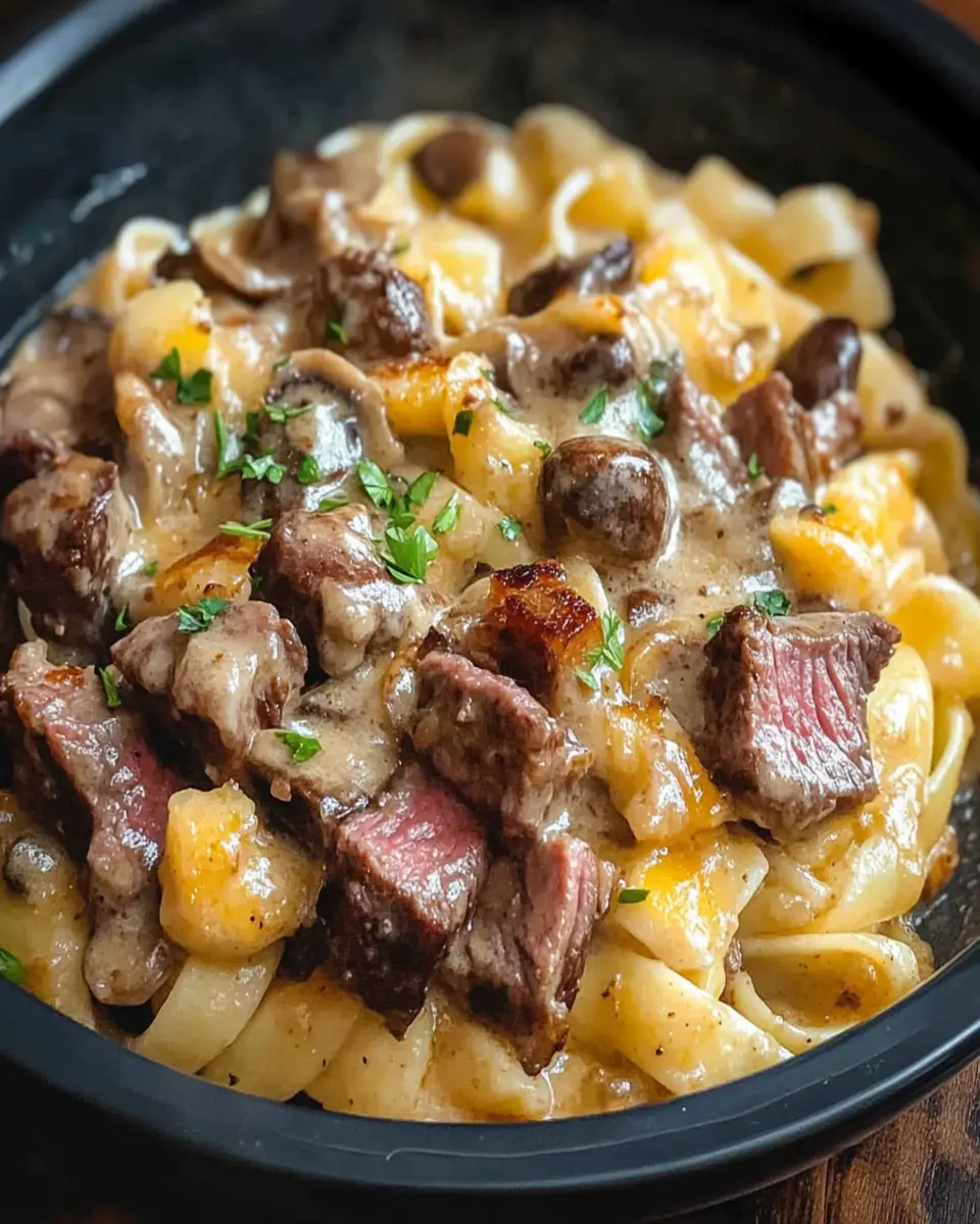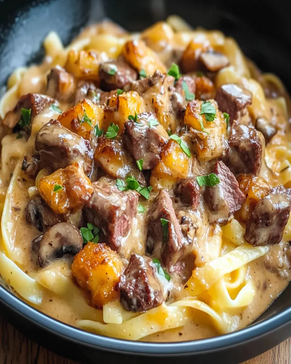 A rich and flavorful creamy steak pasta dish featuring mushrooms and a whiskey-infused sauce.