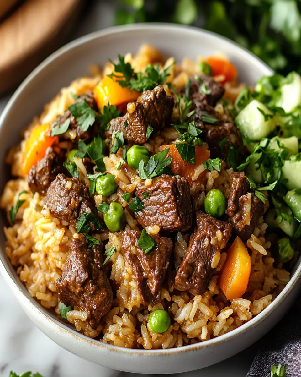 A savory and easy one-pot meal featuring tender beef and fluffy rice, infused with aromatic spices.