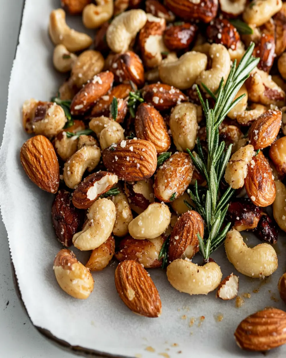 Rosemary Parmesan Roasted Nuts are a savory snack made by roasting a blend of mixed nuts with fresh rosemary, parmesan cheese, and spices. This delightful combination creates a crunchy, flavorful treat that is perfect for any occasion.
